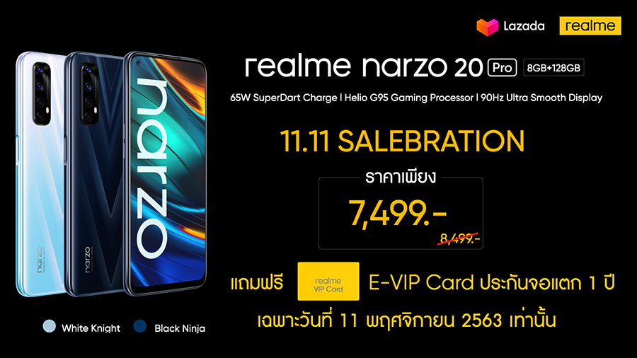 realme narzo 20 Pro เปิดราคาวางจำหน่ายในราคา 8,499 บาท สองสีตัวเครื่องคือ สีดำ Black ninja และสีขาว White Knight และพิเศษ! realme ได้จัดแคมเปญ 11.11 Salebration เฉพาะในวันที่ 11 พฤศจิกายน สามารถสั่งซื้อ realme narzo 20 Pro ในราคาพิเศษเพียง 7,499 บาท พร้อมรับประกันหน้าจอแตก 1 ปี วางจำหน่ายเฉพาะช่องทาง Lazada เท่านั้น