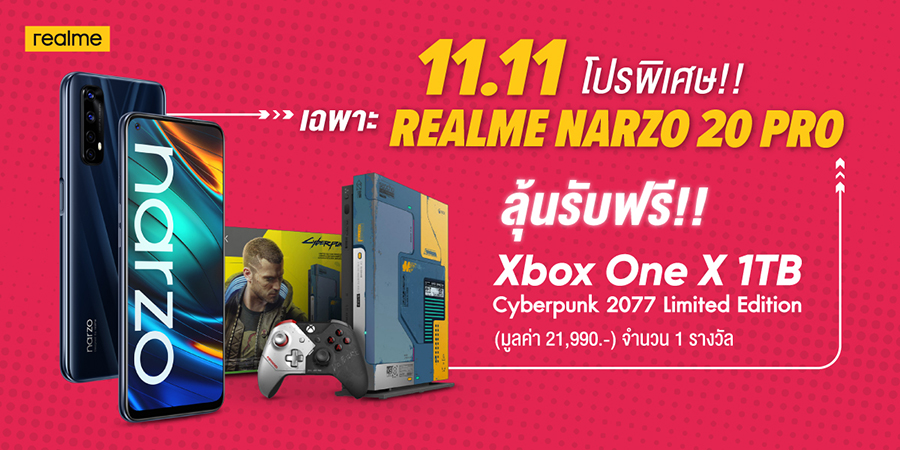 เฉพาะลูกค้าที่สั่งซื้อ realme narzo 20 Pro ผ่านทาง realme official store ใน Lazada ภายในวันที่ 11 พฤศจิกายน 2563 เท่านั้น ลุ้นรับฟรี Xbox One X มูลค่า 18,990 บาท จำนวน 1 รางวัล