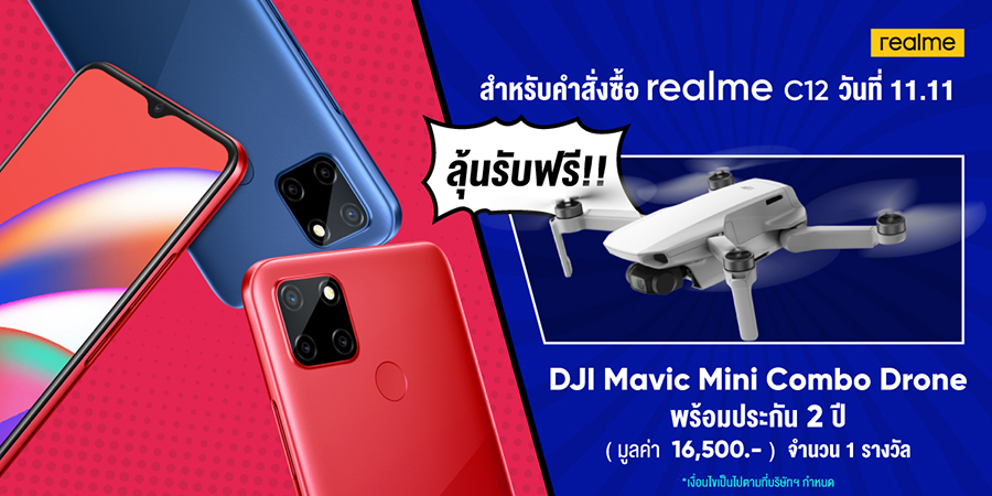 เฉพาะลูกค้าที่สั่งซื้อ realme C12 ผ่านทาง realme Official Shop ใน Shopee ภายในวันที่ 11 พฤศจิกายน 2563 เท่านั้น ลุ้นรับฟรี DJI MAVIC MINI FLY MORE COMBO Drone พร้อมประกันศูนย์ 2 ปี มูลค่า 16,500 บาท จำนวน 1 รางวัล