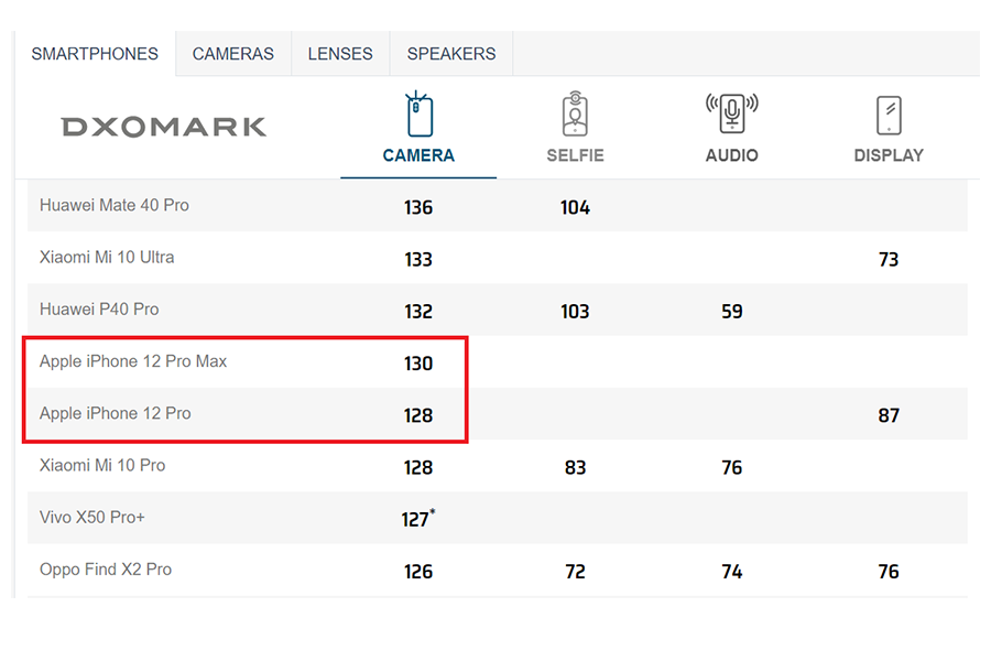 โดยทาง DxOMark ได้ให้คะแนนรวมของการทดสอบกล้องถ่ายรูปบน iPhone 12 Pro อยู่ที่ 128 คะแนน มีคะแนนรวมอยู่อันดับที่ 5 ร่วมกับ Xiaomi Mi 10T Pro และมีคะแนนสูงขึ้นจาก iPhone 11 Pro รุ่นก่อนอยู่ 4 คะแนน ในขณะที่ iPhone 12 Pro Max ได้คะแนนการทดสอบรวมอยู่ที่ 130 คะแนน ซึ่งสูงกว่า iPhone 12 Pro อยู่ 2 คะแนน ทำคะแนนรวมอยู่ที่อันดับที่ 4 ของตาราง ทั้งๆ ที่ตามข้อมูลสเปคของ Apple ระบุว่าทั้งสองรุ่นใช้โมดูลกล้องและชุดเซ็นเซอร์ LiDAR เหมือนกันทั้งหมด