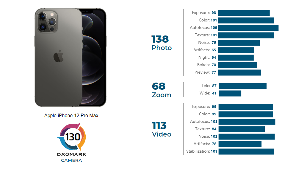 ซึ่งจากผลการทดสอบของ DxOMark พบว่าในเรื่องของการถ่ายภาพนิ่ง สิ่งที่ iPhone 12 Pro Max ทำได้ดีกว่า iPhone 12 Pro อยู่ที่ระบบโฟกัสภาพที่ทำได้ไวและแม่นยำกว่า รวมถึงการเก็บรายละเอียดของวัตถุในภาพ การควบคุมแสงให้ใกล้เคียงกับของจริง และการจัดการนอยด์รบกวน โดยทั้งหมดที่ว่ามา iPhone 12 Pro Max ทำได้ดีกว่า iPhone 12 Pro ทั้งหมด ในขณะที่รายละเอียดผลลัพธ์ในส่วนอื่นๆ รวมถึงงานวีดีโอทั้งสองรุ่นให้ประสิทธิภาพที่ไม่แตกต่างกันอย่างมีนัยสำคัญ