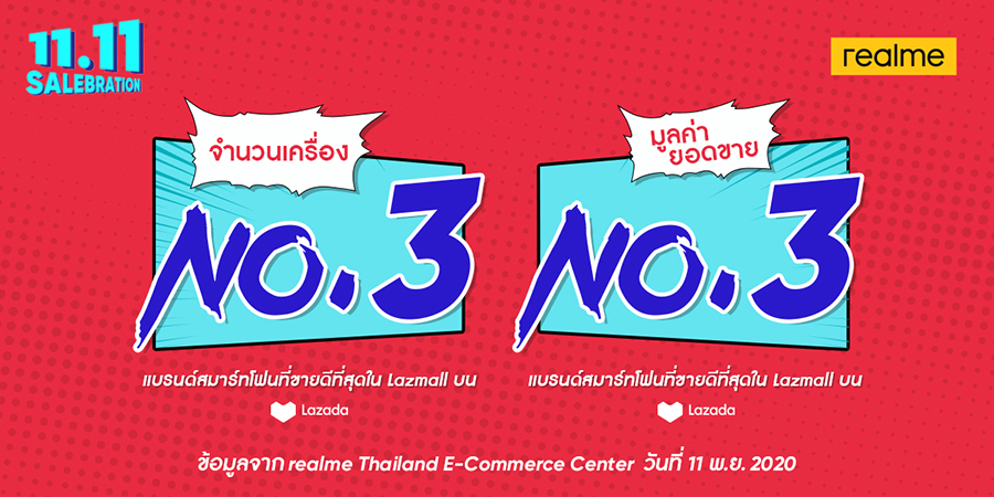 ซึ่งจากแคมเปญ 11.11 SALEBRATION เมื่อวันที่ 11 พฤศจิกายนที่ผ่านมา realme ครองตำแหน่งแบรนด์สมาร์ทโฟนที่ขายดีอันดับ 3 ในด้านของยอดจำหน่ายสมาร์ทโฟนต่อเครื่อง และในด้านของยอดขายสมาร์ทโฟนบน Lazada ในหมวดหมู่ Lazmall