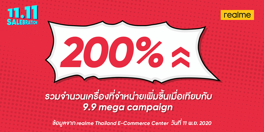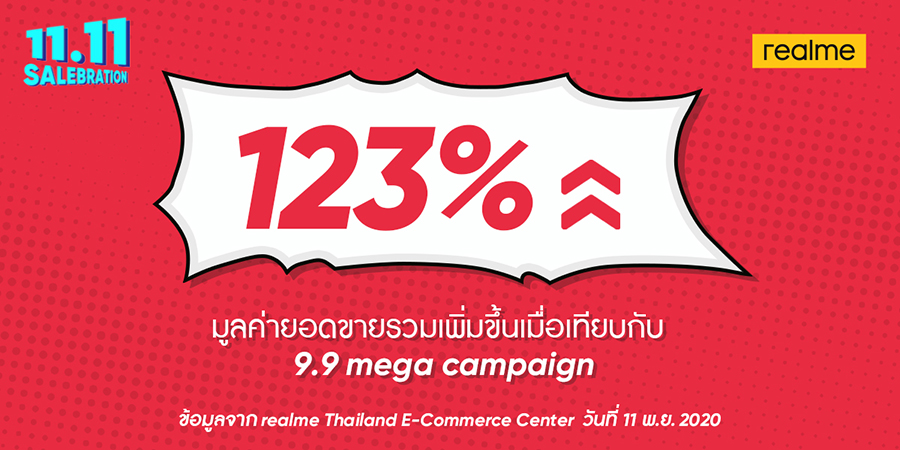 realme ประกาศความสำเร็จจากแคมเปญ 11.11 SALEBRATION ด้วยยอดขายที่เติบโตทะลุกว่า 123% และยอดจำหน่ายต่อเครื่องกว่า 200%