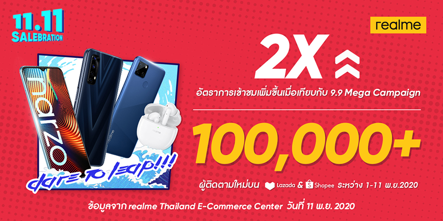 นอกจากนี้แคมเปญ 11.11 SALEBRATION ยังได้รับกระแสตอบรับดีเยี่ยม โดยมีอัตราการเข้าชม realme Official Store ในวันที่ 11.11 เพิ่มขึ้นเป็น 2 เท่า เมื่อเทียบกับแคมเปญ 9.9 Mega Campaign ที่ผ่านมา และมีผู้ติดตามเพิ่มขึ้นมากกว่า 100,000 คน ผ่านทางช่องทาง Lazada และ Shopee ในช่วงวันที่ 1 ถึง 11 พฤศจิกายนที่ผ่านมา