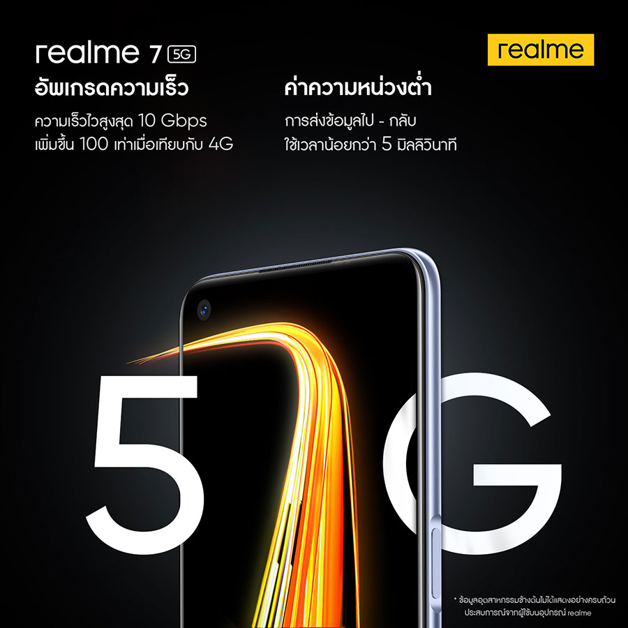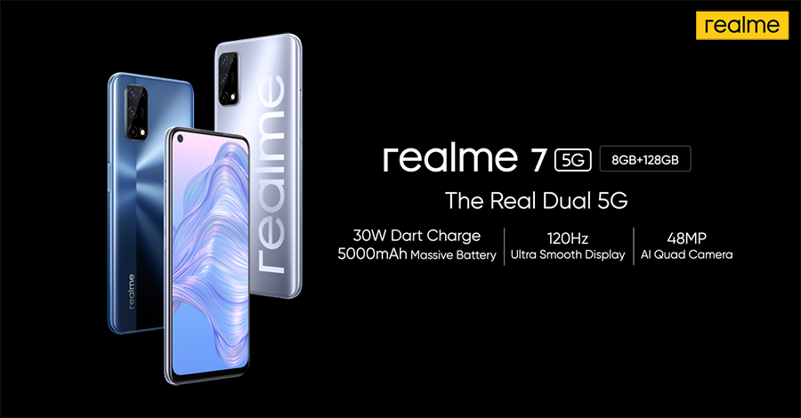 realme 7 5G สมาร์ทโฟน 5G รุ่นใหม่ล่าสุด เปิดตัวโดยยึดแนวคิดสมาร์ทโฟน 5G ที่ทุกคนสามารถเป็นเจ้าของได้ มาพร้อมเทคโนโลยีชาร์จเร็ว 30W Dart Charge แบตเตอรี่ความจุ 5,000 mAh หน้าจอแสดงผล Ultra Smooth ขนาด 6.5 นิ้ว Refresh Rate 120Hz กล้องหลัง AI 4 เลนส์ ความละเอียด 48MP