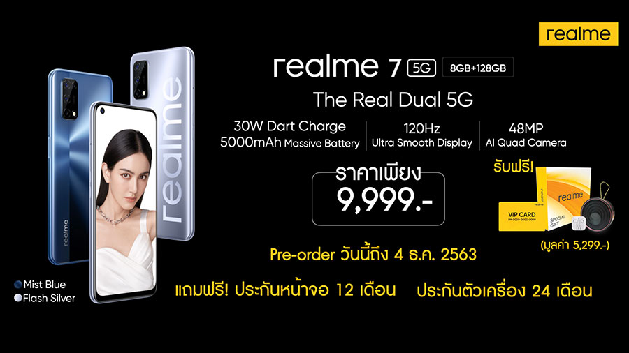 realme 7 5G ความจุ 8GB + 128GB วางจำหน่ายในราคาเพียง 9,999 บาท สามารถ Pre-order ได้แล้วตั้งแต่วันนี้ - 4 ธันวาคม 2563 พร้อมรับฟรี E-VIP Card ประกันจอแตก 1 ปี มูลค่า 4,000 บาท Special Gift Box มูลค่า 1,299 บาท และขยายระยะเวลารับประกันตัวเครื่องนานถึง 24 เดือน รวมมูลค่ากว่า 5,299 บาท โดยจะวางจำหน่ายอย่างเป็นทางการตั้งแต่วันที่ 5 ธันวาคม 2563
