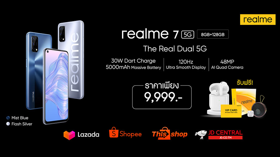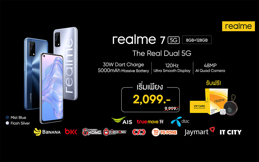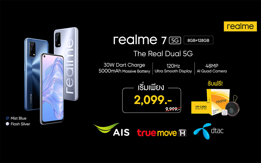 พิเศษสุด สำหรับช่องทาง AIS, Truemove H และ Dtac สามารถเป็นเจ้าของ realme 7 5G ได้ในราคาเริ่มต้นเพียง 2,099 บาทเท่านั้น