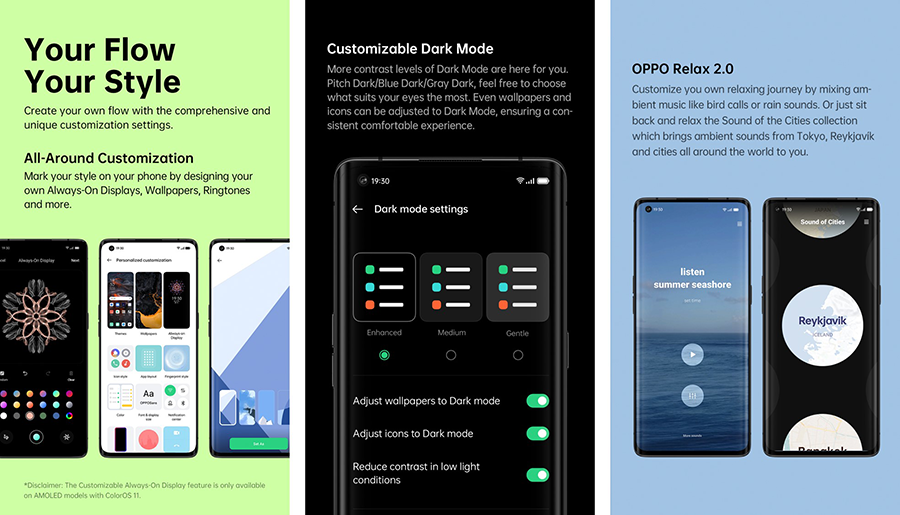 โดยผู้ใช้สามารถสร้าง Always-On Display, ธีม, โทนสี และภาพพื้นหลัง ตลอดจนรูปแบบตัวอักษร ไอคอน และเสียงเรียกเข้าของตนเองได้ นอกจากนี้ ColorOS 11 ยังปรับปรุง Dark Mode ของ Android ด้วยโทนสีสามแบบพร้อมสามารถปรับระดับความคอนทราสต์ได้ ในขณะเดียวกัน OPPO Relax 2.0 ยังสามารถให้ผู้ใช้สร้างเสียง White Noise ของตัวเองได้ พร้อมกับนำเสนอคอลเล็กชันเสียงที่สมจริงและน่าทึ่งจากเมืองต่างๆ ทั่วโลก