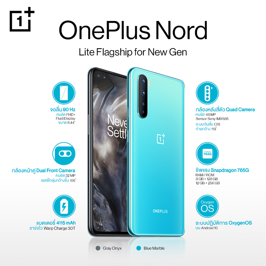 OnePlus Nord - Lite Flagship for New Gen คุณภาพในระดับเรือธง มาพร้อมดีไซน์ที่ออกแบบมาให้จับถนัดมือ กับหน้าจอแบบ Fluid Display ขนาด 6.44 นิ้ว และค่า Refresh Rate 90Hz กล้องหลัง 4 ตัว ความคมชัดสูงสุด 48MP และครั้งแรกของทาง OnePlus ด้วยกล้องหน้าคู่คมชัดสูงสุดที่ 32MP สามารถบันทึกวิดีโอความชัดสูงสุดที่ 4K 60fps พร้อมมอบประสบการณ์การใช้งานที่ลื่นไหล เร็วแรงกับสเปกภายใน Qualcomm Snapdragon 765G บนระบบปฏิบัติการ OxygenOS ความจุแบตเตอรี่ 4,115 mAh และเทคโนโลยีชาร์จเร็ว Warp Charge 30T ที่สามารถชาร์จแบตเตอรี่ได้ 70% ภายใน 30 นาที มั่นใจในคุณภาพการใช้งานด้วยการอัปเดตซอฟแวร์ความปลอดภัยต่างๆ อย่างต่อเนื่อง การพัฒนาปรับปรุงระบบ เพื่อประสิทธิภาพการใช้งานสมาร์ทโฟนของ OnePlus อย่างดีที่สุด กับดีไซน์สีสันที่ได้แรงบันดาลใจจากโลกธรรมชาติ นำมาพัฒนาเป็นที่สวยงามลงตัว ทั้งหมด 2 สี ได้แก่ สีฟ้าหินอ่อน Blue Marble และสีเทา Gray Onyx