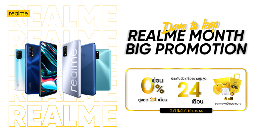 มาร่วมฉลองไปกับ realme ในแคมเปญ "realme Month Big Promotion" จัดเต็มสมาร์ทโฟนเรียลมี ผ่อน 0% สูงสุด 24 เดือน ประกันตัวเครื่องนานสูงสุด 24 เดือน พร้อมรับฟรี! ของสมนาคุณพิเศษอีกมากมาย ตั้งแต่วันนี้ -10 มกราคม 2564 ห้ามพลาด!
