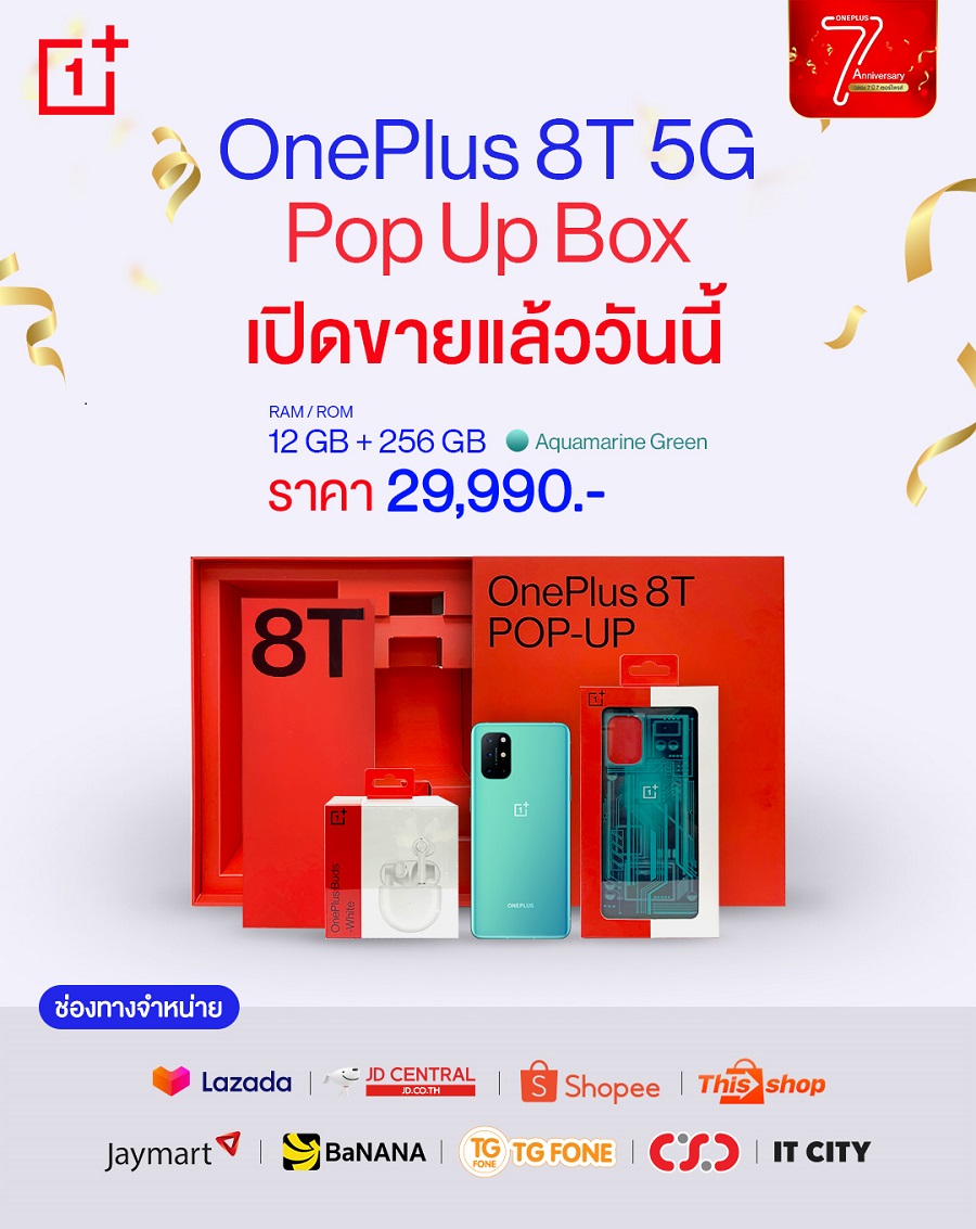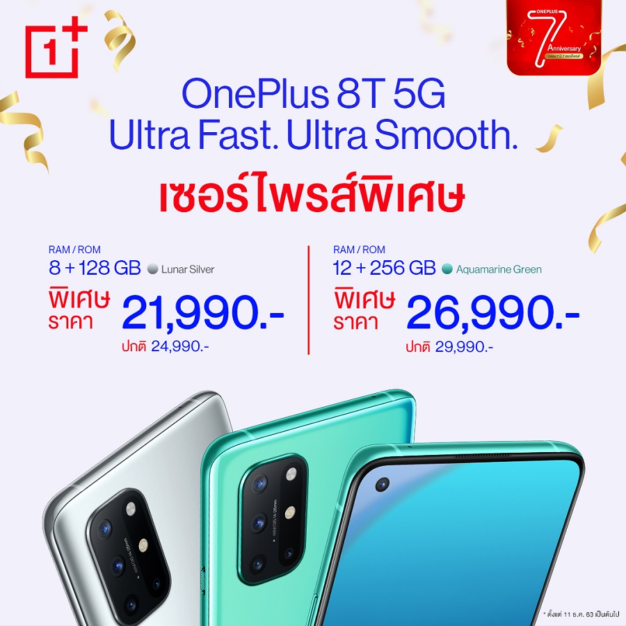 ฉลองครบรอบ 7 ปีของทางแบรนด์ OnePlus มอบเซอร์ไพรส์สุดยิ่งใหญ่ เพื่อเป็นของขวัญแก่แฟน OnePlus ทุกท่าน ตลอดเดือนธันวาคม สุดเซอร์ไพรส์ OnePlus 8T 5G ปรับลดราคา 3,000 บาททุกรุ่น