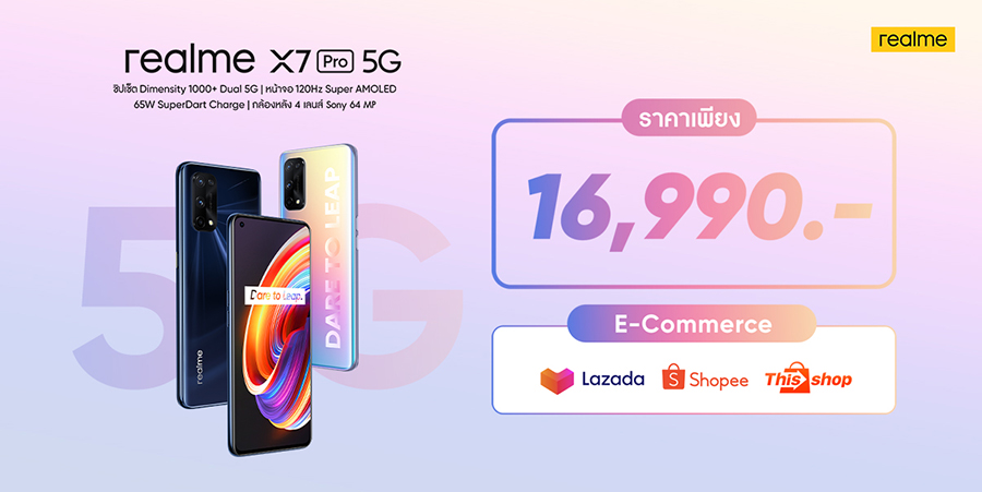 สะดวกสบายกับการสั่งซื้อ ด้วยช่องทาง E-Commerce อย่าง Lazada, Shopee และ Thisshop โดยสามารถเป็นเจ้าของ realme X7 Pro 5G ความจุ 8GB + 128GB ในราคาเพียง 16,990 บาท พร้อมโปรโมชั่นผ่อน 0% นานสูงสุด 24 เดือน แถมฟรี! กระเป๋าเป้ realme Jet Black Bag มูลค่า 1,890 บาท และประกันตัวเครื่องนาน 24 เดือน เมื่อซื้อภายในวันที่ 10 มกราคม 2564