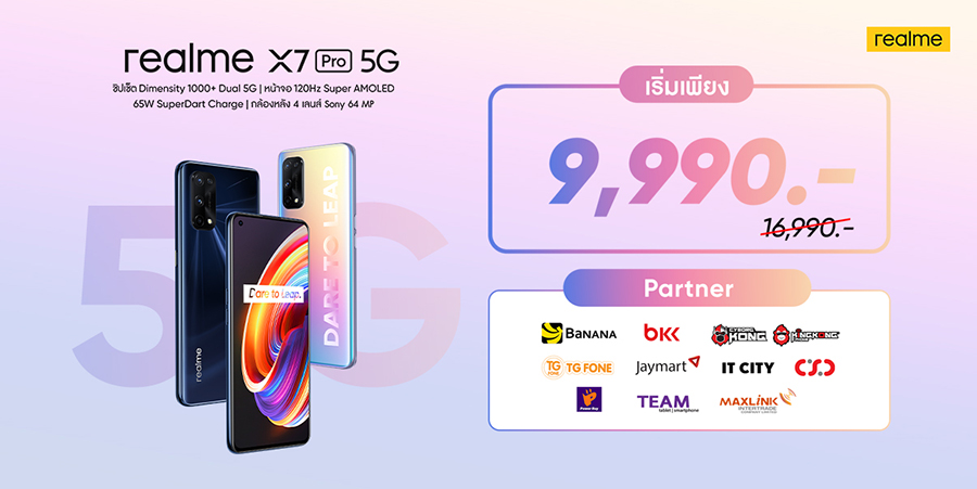 สำหรับตัวแทนจำหน่าย ไม่ว่าจะเป็น Banana, BKK, Cyborg Kong, Kingkongphone, TGfone, Jaymart, IT City และ CSC สามารถเป็นเจ้าของ realme X7 Pro 5G ความจุ 8GB + 128GB ในราคาเริ่มต้นเพียง 9,990 บาท จากปกติ 16,990 บาท พร้อมโปรโมชั่นผ่อน 0% นานสูงสุด 24 เดือน แถมฟรี! กระเป๋าเป้ realme Jet Black Bag มูลค่า 1,890 บาท และประกันตัวเครื่องนาน 24 เดือน เมื่อซื้อภายในวันที่ 10 มกราคม 2564