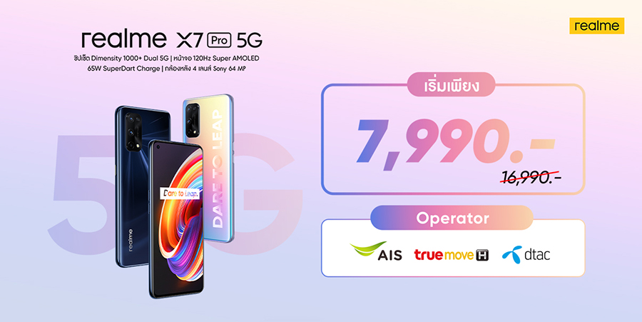 realme แบรนด์สมาร์ทโฟนเพื่อคนรุ่นใหม่ที่เติบโตเร็วที่สุดในโลก พร้อมให้ทุกคนเป็นเจ้าของ realme X7 Pro 5G แล้ววันนี้ โดยมาพร้อมกับชิปเซ็ตประมวลผลสุดทรงพลัง Dimensity 1000+ ดีไซน์บางเบา พร้อมสีสันที่โดดเด่นน่าใช้งาน หน้าจอแบบ Super AMOLED ขนาด 6.5 นิ้ว ลื่นไหลด้วยอัตรา Refresh Rate 120Hz ชาร์จไวด้วย 65W SuperDart Charge วางจำหน่ายแล้ววันนี้ ในราคาเริ่มต้นเพียง 7,990 บาท จากปกติ 16,990 บาท พร้อมโปรโมชั่นผ่อน 0% นานสูงสุด 24 เดือน แถมฟรี! กระเป๋าเป้ realme Jet Black Bag มูลค่า 1,890 บาท และประกันตัวเครื่องนาน 24 เดือน เมื่อซื้อภายในวันที่ 10 มกราคม 2564 ที่ realme Brand Shop และตัวแทนจำหน่ายทั่วประเทศ