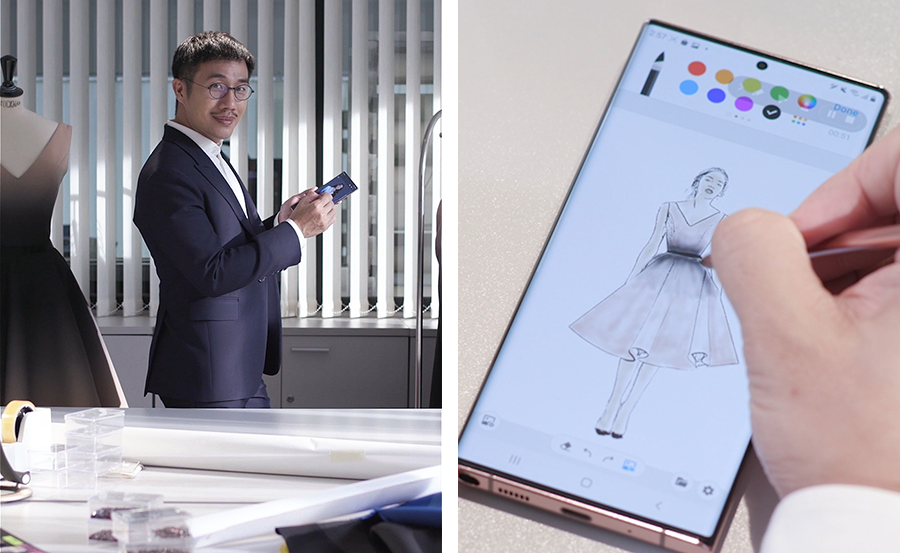 ฌอน - ชวนล ไคสิริ ดีไซเนอร์และเจ้าของแบรนด์โพเอม (POEM) ที่โด่งดังจนคนกล่าวขานว่า 'อยากขึ้นยานแม่ต้องแวร์โพเอม' มาเผยตัวช่วยเบื้องหลังการทำงานว่า "ผมเป็นแฟชั่นดีไซเนอร์ที่ทำทุกขั้นตอนด้วยตัวของผมเอง การออกแบบเสื้อผ้า ดีเทลหลายอย่างถือเป็นเรื่องที่ลึกซึ้ง ซึ่ง S Pen ก็สามารถตอบโจทย์ได้เป็นอย่างดี และผมก็ใช้ S Pen ดีไซน์ชุดอยู่ทุกวัน ไม่ว่าจะเป็น ซิกเนเจอร์ของแบรนด์ POEM ที่ทุกคนรู้จักดี อย่างสี Ombre ผมก็ใช้ S Pen ในการสเก็ตช์และลงสี ทั้งนี้ อีกเหตุผลหนึ่งที่ผมชอบใช้ S Pen เพราะว่าทุกครั้งผมสามารถ Undo งานแล้วเริ่มต้นทำใหม่ได้อย่างง่ายดาย รวมถึงทุกครั้งที่ทีมงานส่งรูปฟิตติ้ง (Fitting) มาเป็นไฟล์ PDF ผมก็สามารถแก้ไขลายเส้นทับไฟล์ PDF นั้นไปได้เลย บอกเลยว่าการใช้ S Pen ไม่ใช่เรื่องยาก เพราะถ้ายาก ผมคงไม่เลือกใช้อย่างแน่นอน"