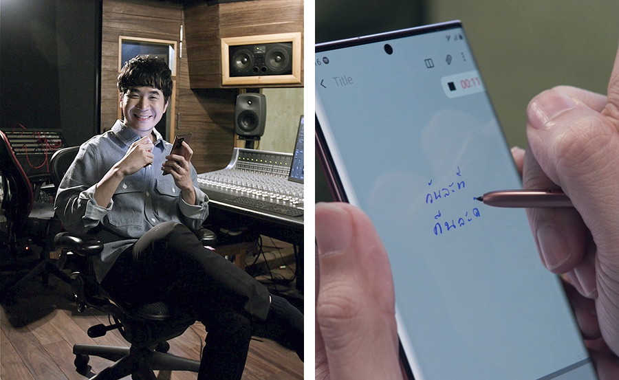 แสตมป์ - อภิวัชร์ เอื้อถาวรสุข ครีเอทีฟไดเรกเตอร์และเจ้าของค่ายเพลงที่ทำงานได้ทุกที่อย่างไม่มีข้อจำกัด เล่าว่า "หลายๆ เพลงที่ผมแต่งขึ้นมาก็เริ่มจากใน Samsung Galaxy Note นี่แหละครับ อย่างเมื่อผมคิดทำนองหรือเนื้อเพลงขึ้นมาได้เมื่อไหร่ ผมก็จะจดคีย์เวิร์ด (Keyword) พร้อมอัดเสียงลงไปใน Samsung Notes แล้วค่อยมาฟังอีกครั้ง ก่อนเติมเนื้อเพลงให้ครบในภายหลัง โดยผมไม่ต้องกังวลเลย เพราะเวลาที่จดเบี้ยวๆ เอียงๆ Galaxy Note20 จะปรับให้ข้อความนั้นตรงได้ ซึ่งทำให้ผมส่งให้คนอื่นอ่านต่อได้ง่ายมากเลยครับ"