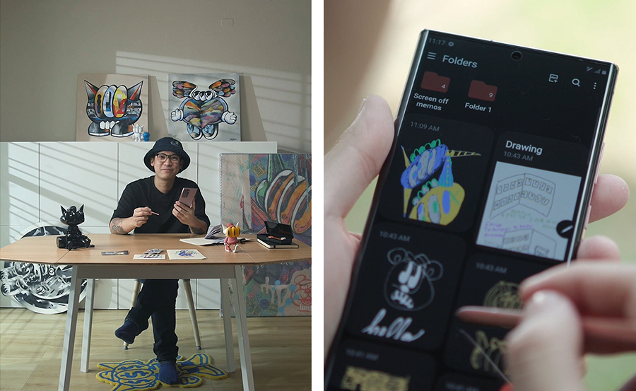 BENZILLA (เบนซิลล่า) หรือ ปริญญา พิเชษฐศิริพร สตรีทอาร์ติสท์ที่โด่งดังด้วยเอกลักษณ์การออกแบบคาแรคเตอร์มนุษย์ต่างดาว 3 ตา ที่ชื่อว่า '3Balls' พูดถึงจุดเริ่มต้นไอเดียภาพวาดของเขาว่า "ตั้งแต่เด็กๆ ผมจะรู้สึกว่าตัวเองเป็นคนนอกโลกตลอดเลย เวลาที่เราอินอะไร เพื่อนมักจะไม่ค่อยอินกับเรา เห็นได้จากผลงานที่เราสื่อสารออกมาทุกวันนี้ เราก็พยายามที่จะสร้างสรรค์สิ่งใหม่ๆ ขึ้นมาเรื่อยๆ ซึ่งเราก็จะมี S Pen ไว้สเก็ตช์สิ่งที่คิดออก วาดเก็บสะสมไว้เรื่อยๆ จนตอนนี้ Galaxy Note เหมือนเป็นคลังไอเดียของผมไปแล้ว อย่างเช่น เวลาผมไปเจอผนังอันหนึ่ง ผมก็จะใช้ Galaxy Note ถ่ายเก็บไว้ แล้วนำมาสเก็ตช์รูปทับ เวลาต้องไปนำเสนองานให้กับลูกค้า ผมก็เพียงแค่ Export ภาพใน Samsung Notes ให้เป็น PowerPoint แล้วส่งไปได้ทันที ง่ายและรวดเร็วสุดๆ เลยครับ"