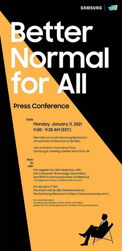 ธีม "Better Normal for All" มาจากแนวคิดที่ว่า เทคโนโลยีที่ดีสามารถพาเราไปสู่อนาคตที่ดีกว่าเดิมได้ ในงานแถลงข่าวของซัมซุงที่ CES เราจะได้อวดโฉมอนาคตที่ดีกว่าเดิมให้ทุกท่านได้เห็น ตัวอย่างเช่น เทคโนโลยีที่ถูกดีไซน์มาเพื่อคุณโดยเฉพาะ ปัญญาประดิษฐ์ (AI) ที่จะยกระดับการใช้ชีวิตภายในบ้าน และนวัตกรรมต่างๆ ที่สามารถเปลี่ยนสังคมและโลกได้ ตัวอย่างเทคโนโลยีคร่าวๆ ที่คุณจะได้พบในงานแถลงข่าวของซัมซุง ได้แก่ ดีกว่า ต้องมีความเป็นตัวคุณได้มากกว่าเดิม คุณคือผู้ที่จะได้ดีไซน์ Better Normal for All ของคุณเอง ตอนนี้เราต่างใช้ชีวิตอยู่บ้านมากขึ้น