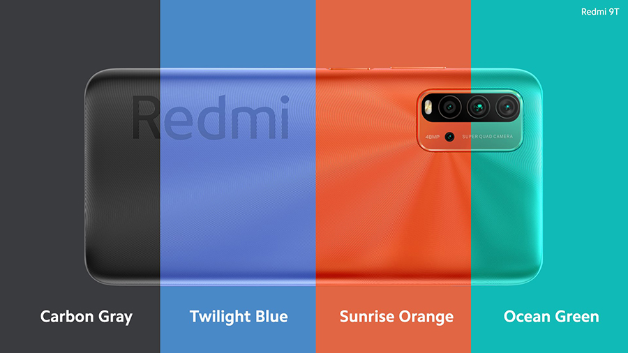Redmi 9T มีด้วยกัน 2 รุ่น และ 4 สีให้เลือก ได้แก่ Carbon Gray, Twilight Blue, Sunrise Orange และ Ocean Green พร้อมวางจำหน่ายแล้วที่ร้าน AIS, dtac, True, Banana, BKK, Kingkong Phone, TG Fone, Jaymart, JD Central, Shopee, Lazada และร้านตัวแทนจำหน่ายที่ร่วมรายการทั่วประเทศ