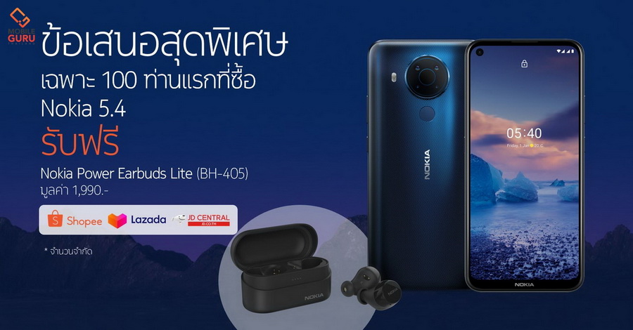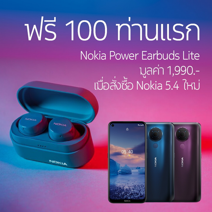 เฉพาะ 100 คนแรก รับฟรี Nokia Power Earbuds Lite มูลค่า 1,990 บาท เมื่อสั่งซื้อ Nokia 5.4 ผ่านร้านค้าออนไลน์ Nokia Official Store ตามที่ระบุ ไม่ควรพลาดนะครับ