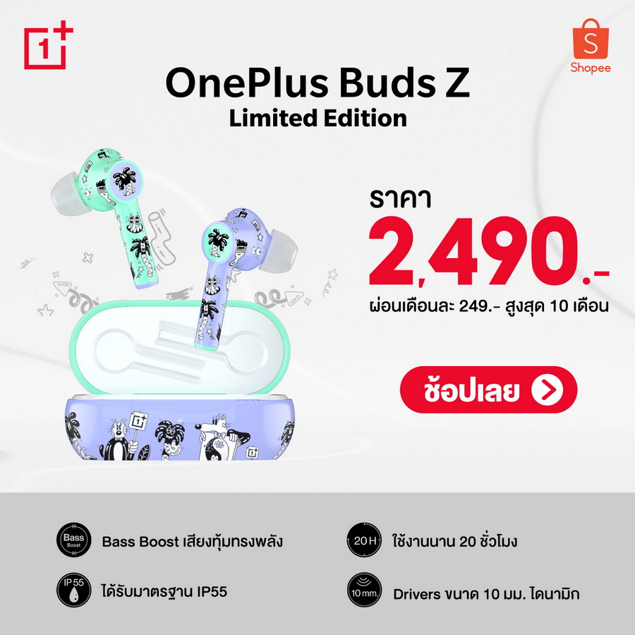OnePlus Buds Z ที่ได้แรงบันดาลใจมาจาก Street Art ใน California โดดเด่นด้วยสีแบบทูโทนม่วงและเขียวมิ้นท์และลวดลายกราฟฟิตีที่เป็นเอกลักษณ์ ทั้งตัวหูฟังและเคส ชาร์จเพียง 10 นาที สามารถใช้งานได้นานถึง 3 ชั่วโมง ยิ่งชาร์จแบตเตอรี่เต็มยังสามารถได้ยาวนานต่อเนื่องถึง 20 ชั่วโมง พร้อมทั้งความหน่วงในการการเชื่อมกับอุปกรณ์อื่น ๆ ที่ต่ำหรือไม่ดีเลย์ กับดีไซน์ in-ear ไม่ตกหล่นได้ง่ายต่อไป อีกทั้งยังมีมาตรฐาน IP55 rating สามารถป้องกันน้ำ หรือเหงื่อได้ OnePlus Buds Z มาในราคา 2,490 บาท สั่งซื้อได้ที่