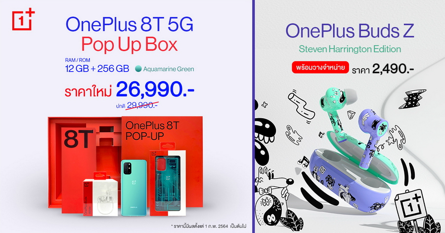 OnePlus 8T 5G Pop Up Box ลดราคาเหลือ 26,990 บาท พร้อมวางจำหน่าย OnePlus Buds Z Steven Harrington Edition ราคา 2,490 บาท
