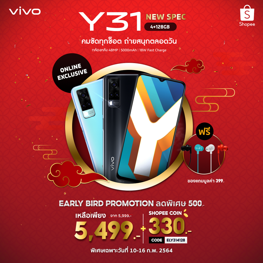 - Vivo 31 (4+128GB) มาพร้อม Early Bird Promotion สุดคุ้ม ที่ลดถึง 500 บาท เหลือ 5,499 บาท จากราคา 5,999 เฉพาะช่วงเปิดตัว และ Coins Cashback ที่ให้คืนสูงสุดถึง 330 coins (โค้ด: ELY314128) ตั้งแต่วันที่ 10 - 16 กุมภาพันธ์ 2564 นี้เท่านั้น นอกจากนี้ยังมีของแถมเป็น หูฟัง Vivo Color Earphone มูลค่า 399 บาท