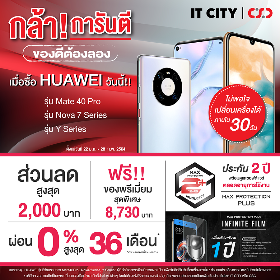 พลาดไม่ได้แล้ว! เมื่อซื้อเครื่อง HUAWEI รุ่น Mate 40 Pro, Nova 7 Series, Y Series ที่ CSC หรือ IT CITY ตั้งแต่วันนี้ - วันที่ 28 กุมภาพันธ์ 2564 พร้อมลงทะเบียนเข้ารับสิทธิ์ แคมเปญ "กล้า! การันตี ของดีต้องลอง" หากภายใน 30 วัน ใช้เครื่องแล้วไม่พึงพอใจ นำเครื่องเดิมมาขอเปลี่ยนเครื่องใหม่เป็นรุ่นอื่น หรือ แบรนด์อื่นได้ เพราะทาง HUAWEI เชื่อมั่นในแอปพลิเคชั่นอย่าง HUAWEI Mobile Services (HMS) หรือเรียกง่ายๆว่า บริการสำหรับมือถือ HUAWEI ที่สามารถตอบโจทย์ในการใช้งาน สำหรับการชีวิตประจำวันได้เป็นอย่างดี ปัจจุบันได้มีผู้ใช้มากกว่า 570 ล้านคน ในมากกว่า 170 ประเทศ ซึ่งมาในรูปแบบดิจิตอลเช่น HUAWEI AppGallery, HUAWEI Themes, HUAWEI Video, HUAWEI Music, HUAWEI Read, HUAWEI Pay, HUAWEI Skytone, HUAWEI Assistant และอื่นๆอีกมากมาย