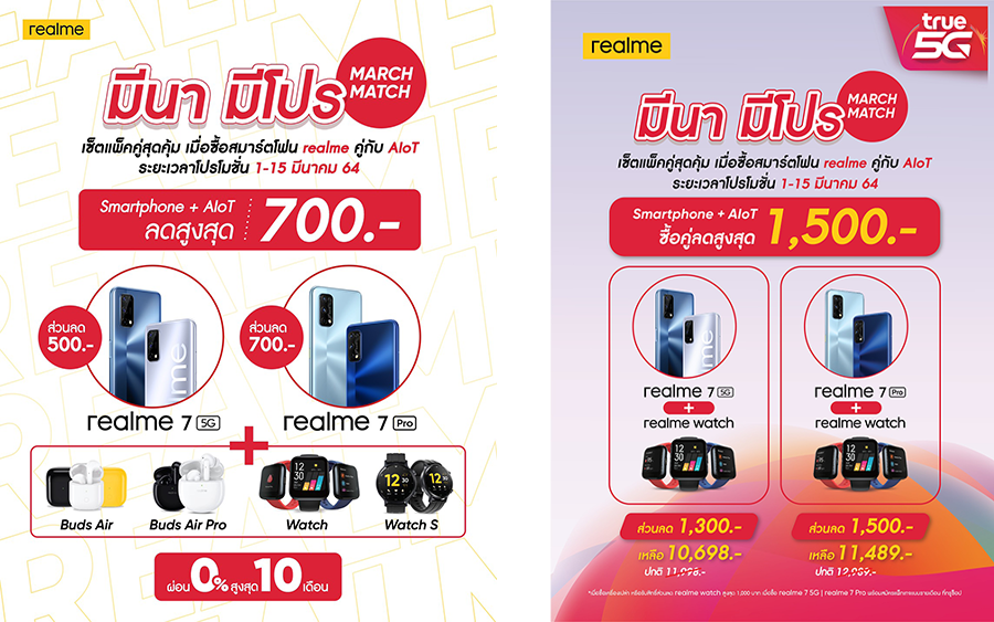 มาร่วมจับคู่ความคุ้มค่าต้อนรับเดือนมีนาคมนี้ไปกับ realme "มีนา มีโปร" ซื้อสมาร์ทโฟน realme คู่กับ AIoT รับส่วนลดพิเศษสูงสุด 700 บาท สำหรับช่องทาง AIS, Com7, Jaymart, TG Fone, IT City, CSC และ Power Buy พร้อมความพิเศษจัดเต็มเมื่อซื้อแบบจับคู่* ที่ True Shop รับส่วนลดสูงสุดถึง 1,500 บาท วันนี้ - 15 มีนาคม 2564 เท่านั้น