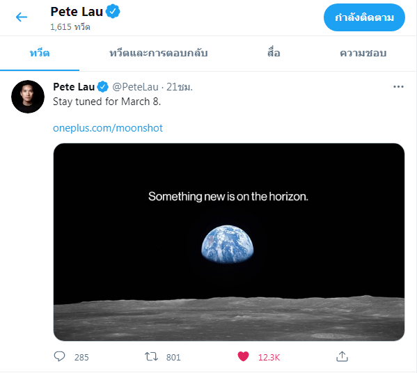 OnePlus 9 Series สมาร์ทโฟนที่จะมาพร้อมแบรนด์กล้องระดับตำนาน Hasselblad เตรียมเปิดตัววันที่ 8 มี.ค. 64 แล้วครับ โดยใน Twitter ของคุณ Pete Lau เจ้าของและ CEO ของแบรนด์ OnePlus ได้ออกมาโพสต์ภาพมุมมองจากดวงจันทร์ มองมายังโลก พร้อมข้อความว่า "Something new is on the horizon" แปลว่า "สิ่งใหม่ที่อยู่บนเส้นขอบฟ้า" ซึ่งเป็นการสื่อถึงจุดขายสำคัญนั่นก็คือความร่วมมือระหว่าง OnePlus และแบรนด์ Hasselblad นั่นเอง ผมนี่ตื่นเต้นมากๆเลยครับ แฟนๆอดใจรอกันได้เลย อีกไม่นานแล้ว ส่วนกำหนดวางจำหน่ายในประเทศไทยต้องติดตามกันต่อไปนะครับ