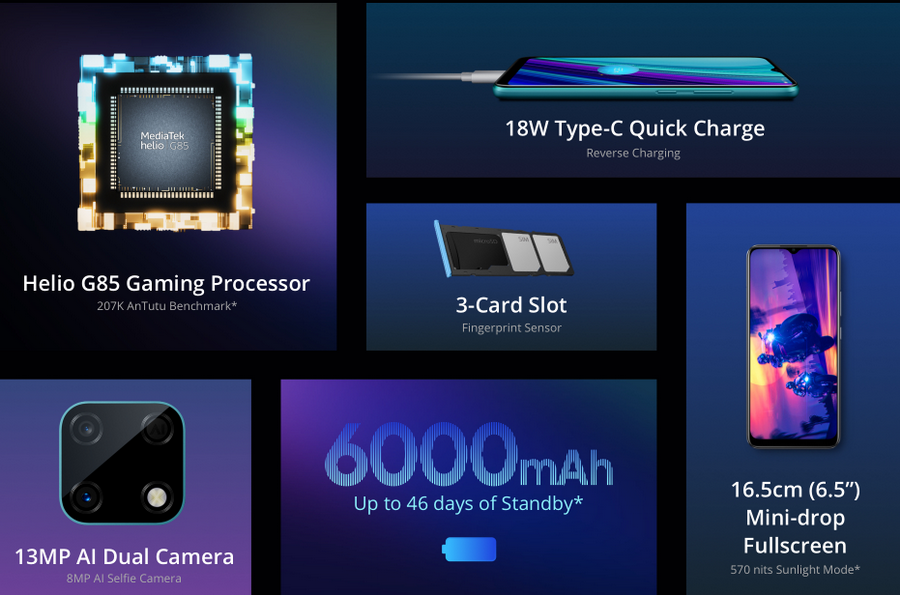 realme Narzo 30A มาพร้อมดีไซน์ที่ดูน่าสนใจ หน้าจอ IPS ขนาด 6.5 นิ้ว ความละเอียด HD+ 720 x 1600 pixels (270 ppi), MediaTek Helio G85, GPU Mali-G52 MC2, RAM 4GB, ROM 64GB รองรับ microSDXC, Wi-Fi 802.11 a/b/g/n/ac, Bluetooth 5.0, GPS, A-GPS, GLONASS, USB Type-C 2.0, เซนเซอร์ Fingerprint (rear-mounted), accelerometer, proximity, compass, แบตเตอรี่ความจุ 6,000 mAh รองรับชาร์จเร็ว 18W