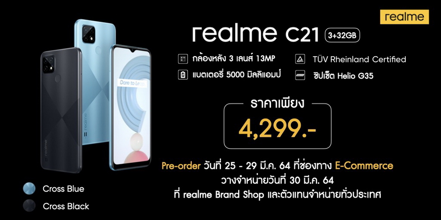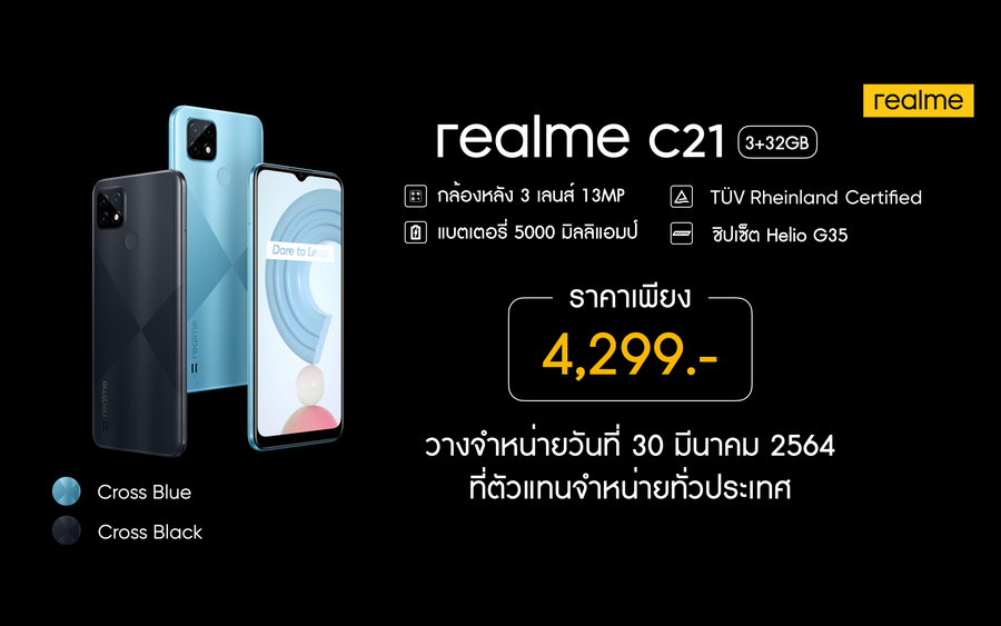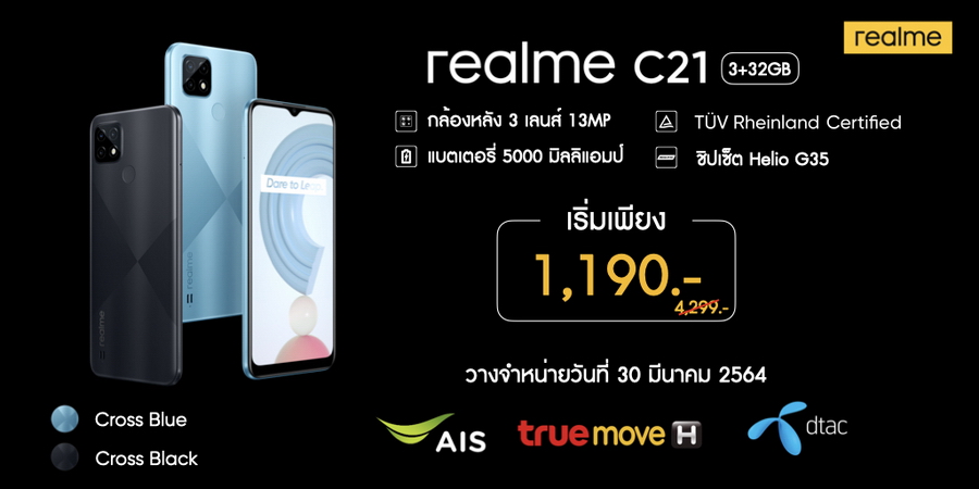 realme C21 มีให้เลือก 2 สี ได้แก่ สีฟ้า Cross Bule และสีดำ Cross Black ราคา 4,299 บาท วางจำหน่ายในวันที่ 30 มีนาคม ที่ realme Brand Shop และตัวแทนจำหน่ายทั่วประเทศ ช่องทาง E-Commerce สามารถเป็นเจ้าของก่อนใครได้ผ่านการ Pre-Order ได้ตั้งแต่วันที่ 25-29 มีนาคมนี้ สำหรับช่องทางโอเปอร์เรเตอร์ไม่ว่าจะเป็น AIS , TruemoveH และ dtac จะมาในราคาพิเศษ เริ่มต้นเพียง 1,190 บาทเท่านั้น สามารถเป็นเจ้าของได้ในวันที่ 30 มีนาคมนี้