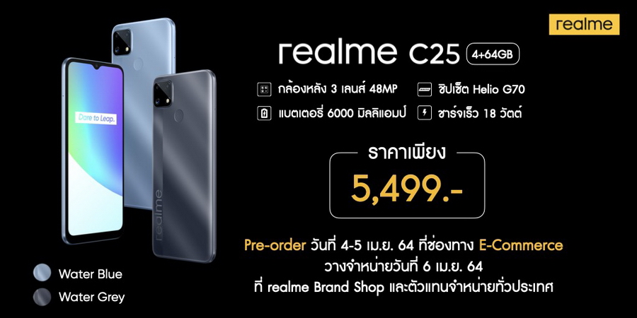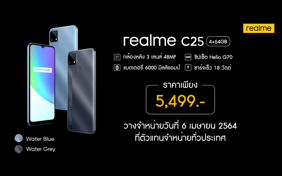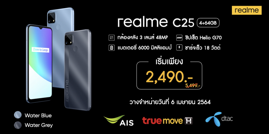 realme C25 มีให้เลือก 2 สี ได้แก่ Water Grey และ Water Blue ราคา 5,499 บาท วางจำหน่ายในวันที่ 6 เมษายน ที่ realme Brand Shop และตัวแทนจำหน่ายทั่วประเทศ ช่องทาง E-Commerce สามารถเป็นเจ้าของก่อนใครได้ผ่านการ Pre-Order ได้ตั้งแต่วันที่ 4-5 เมษายนนี้ ช่องทางโอเปอร์เรเตอร์ไม่ว่าจะเป็น AIS TruemoveH และ dtac จะมาในราคาเริ่มต้นเพียง 2,490 บาทเท่านั้น สามารถเป็นเจ้าของได้ในวันที่ 6 เมษายน