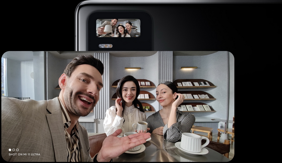 Mi 11 Ultra กล้องหน้าความละเอียด 20MP F2.2, 27 มม. (wide) มีหน้าจอ AMOLED ขนาด 1.1 นิ้ว ช่วยให้นางแบบ-นายแบบของเราเห็นภาพที่กำลังจะถ่ายเพื่อช่วยให้วางเฟรมได้อย่างเหมาะสม ไม่เสียเวลาถ่ายแก้หลายครั้ง และมาพร้อมกล้องหลัง 3 เลนส์ ความละเอียด