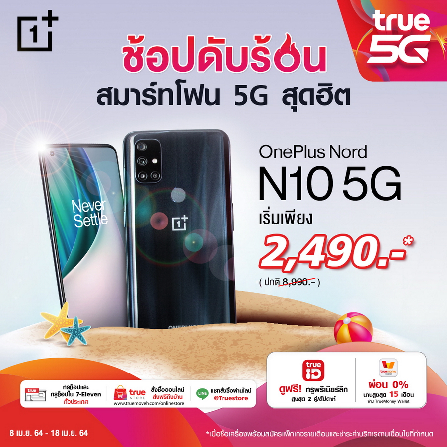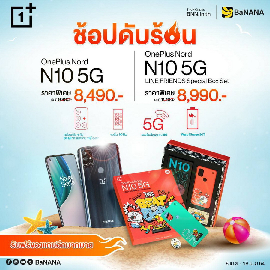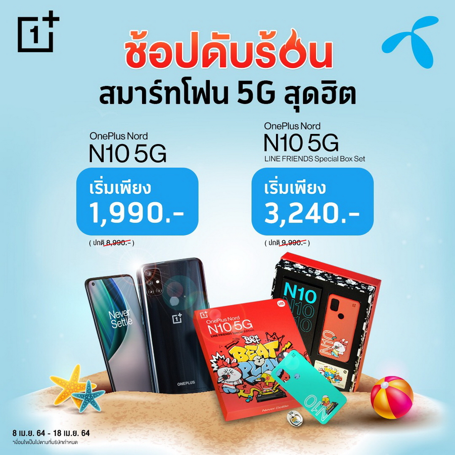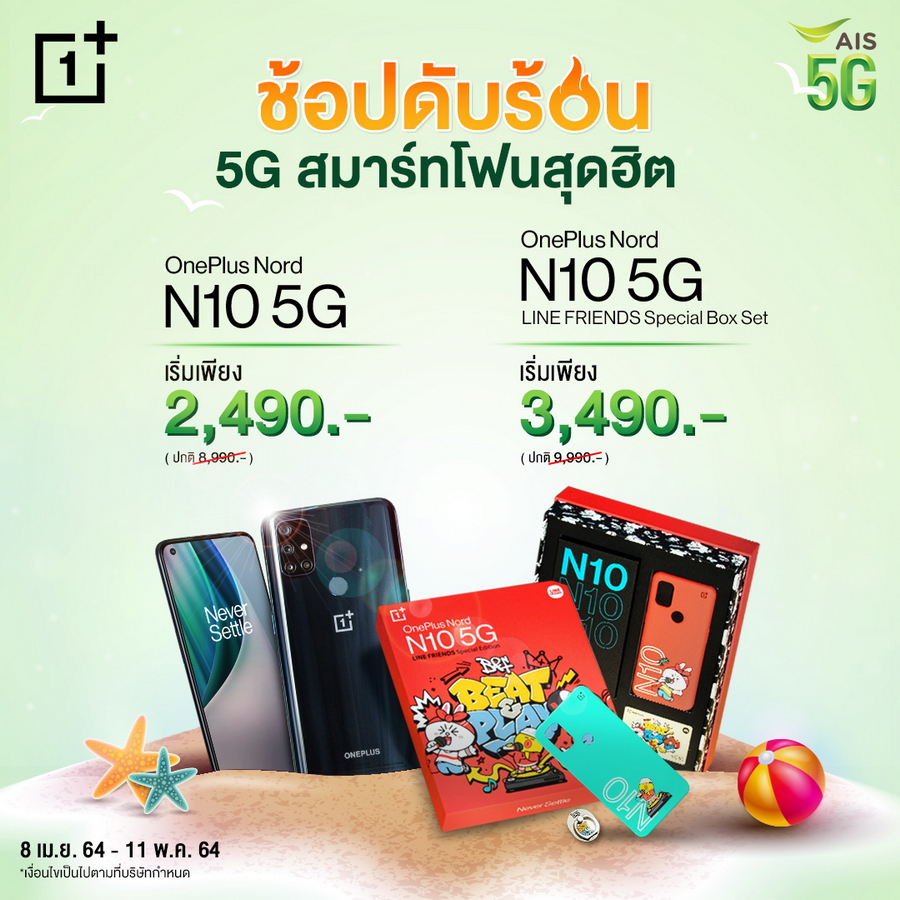 AIS เมื่อซื้อ OnePlus Nord N10 5G หรือ LINE FRIENDS Special Box Set พร้อมแพ็กเกจรายเดือน 5G Hot Deal Max Speed เริ่มต้น 699 บาท (พร้อมชำระค่าบริการล่วงหน้า) ราคาเครื่องเริ่มต้นเหลือเพียง 2,490 บาท ตั้งแต่วันนี้ - 11 พฤษภาคม 2564