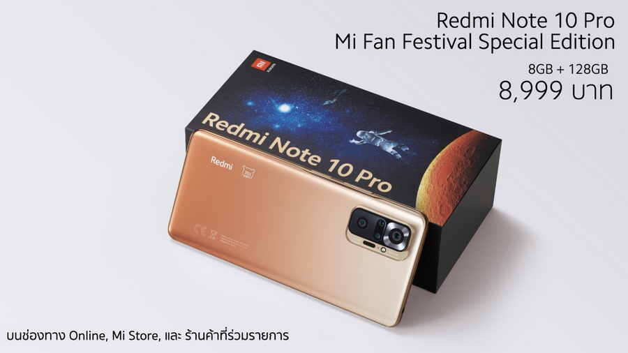 Redmi Note 10 Pro Mi Fan Festival Special Edition พร้อมวางจำหน่ายให้แก่ Mi Fan ชาวไทย โดยมาในสี Gradient Bronze ขนาดความจุ RAM 8GB + ROM 128 GB ในราคา 8,999 บาท วางจำหน่ายที่ช่องทางออนไลน์, Mi store และร้านค้าที่ร่วมรายการ