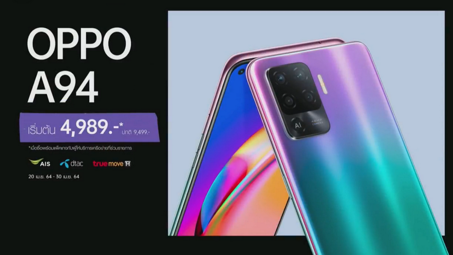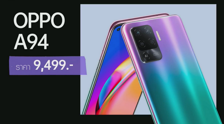 - OPPO A94 มีให้เลือก 2 สี ได้แก่ สีม่วง Fantastic Purple และสีดำ Fluid Black ราคา 9,499 บาท (ซื้อผูกแพ็กเกจกับ AIS, dtac, TrueMove H เริ่มต้นเพียง 4,989 บาท)
