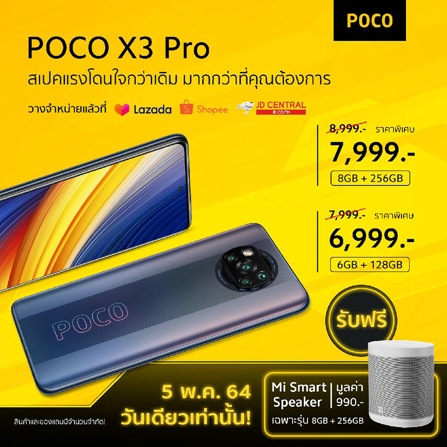 เป็นเจ้าของ POCO X3 Pro ได้เบาสบายกว่าเดิม ในเทศกาล 5.5 ในราคาพิเศษเพียง 6,999 บาท สำหรับรุ่นความจุ 6GB + 128GB และราคาพิเศษเพียง 7,999 บาท สำหรับรุ่นความจุ 8GB + 256GB นอกจากนี้ ลูกค้าที่ซื้อ POCO X3 Pro รุ่นความจุ 8GB + 256GB ยังได้รับของแถมเพิ่มเติม Mi Smart Speaker มูลค่า 990 บาท (ของมีจำนวนจำกัด) ผ่านแพลตฟอร์มอีคอมเมิร์ซ ทั้ง Shopee, Lazada และ JD Central ในเทศกาล 5.5 วันที่ 5 พฤษภาคม วันเดียวเท่านั้น!!!