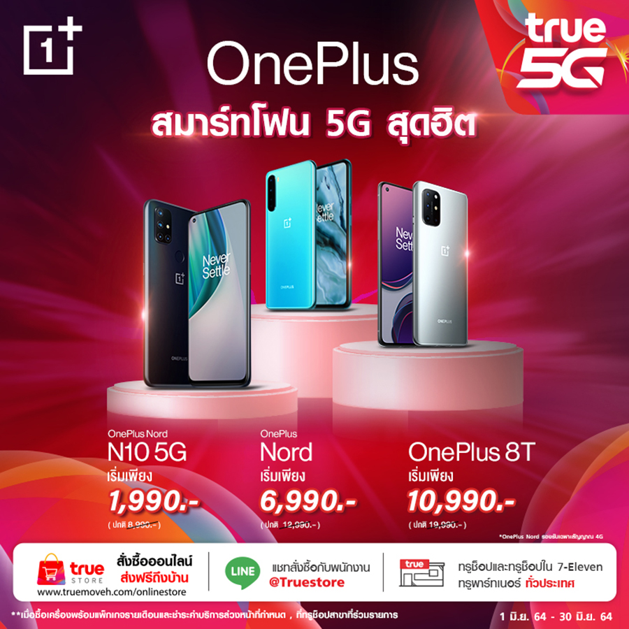 และปิดท้ายด้วย ทรูมูฟ เอช ซื้อเครื่องสมาร์ทโฟน OnePlus ที่ร่วมรายการ รับส่วนลดค่าเครื่องสูงสุดถึง 9,000 บาท เมื่อสมัครพร้อมแพ็คเกจรายเดือนเริ่มต้น 699 บาท (พร้อมชำระค่าบริการล่วงหน้า) ตั้งแต่วันนี้ - 30 มิถุนายน 2564