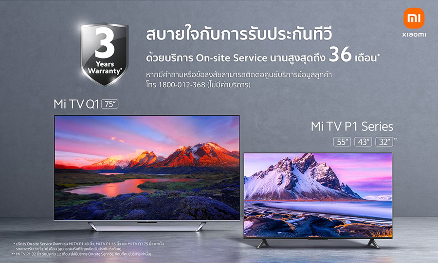 - รุ่น Mi TV P1 43 นิ้ว, Mi TV P1 55 นิ้ว และ Mi TV Q1 75 นิ้ว รับประกัน 36 เดือนและบริการซ่อมนอกสถานที่