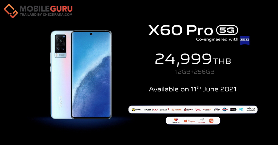 vivo X60 Pro 5G ก่อนใครได้แล้ววันนี้ที่ ราคา 24,999 บาท รับฟรีทันที VIP Card รับประกันตัวเครื่อง 2 ปี ประกันหน้าจอแตก 1 ปี 1 ครั้ง มูลค่า 8,200 บาท และหูฟัง vivo wireless sport lite มูลค่า 1,799 บาท (เงื่อนไขเป็นไปตามที่บริษัทกำหนด) ณ vivo Brand Shop ทุกสาขา ตัวแทนจำหน่ายชั้นนำ BaNANA, TG FONE, Jaymart, CSC, IT City,Kingkong, BKK,Maxling, Power Mall และช่อง vivo Official Online Store รวมถึง vivo Flagship Store บนร้านค้าออนไลน์ชั้นนำทั้ง Lazada, Shopee, JD Central และ Thisshop ติดตามรายละเอียดเพิ่มเติมได้ที่