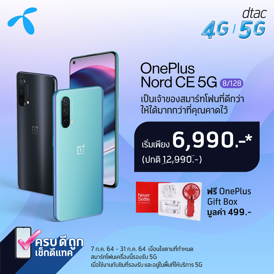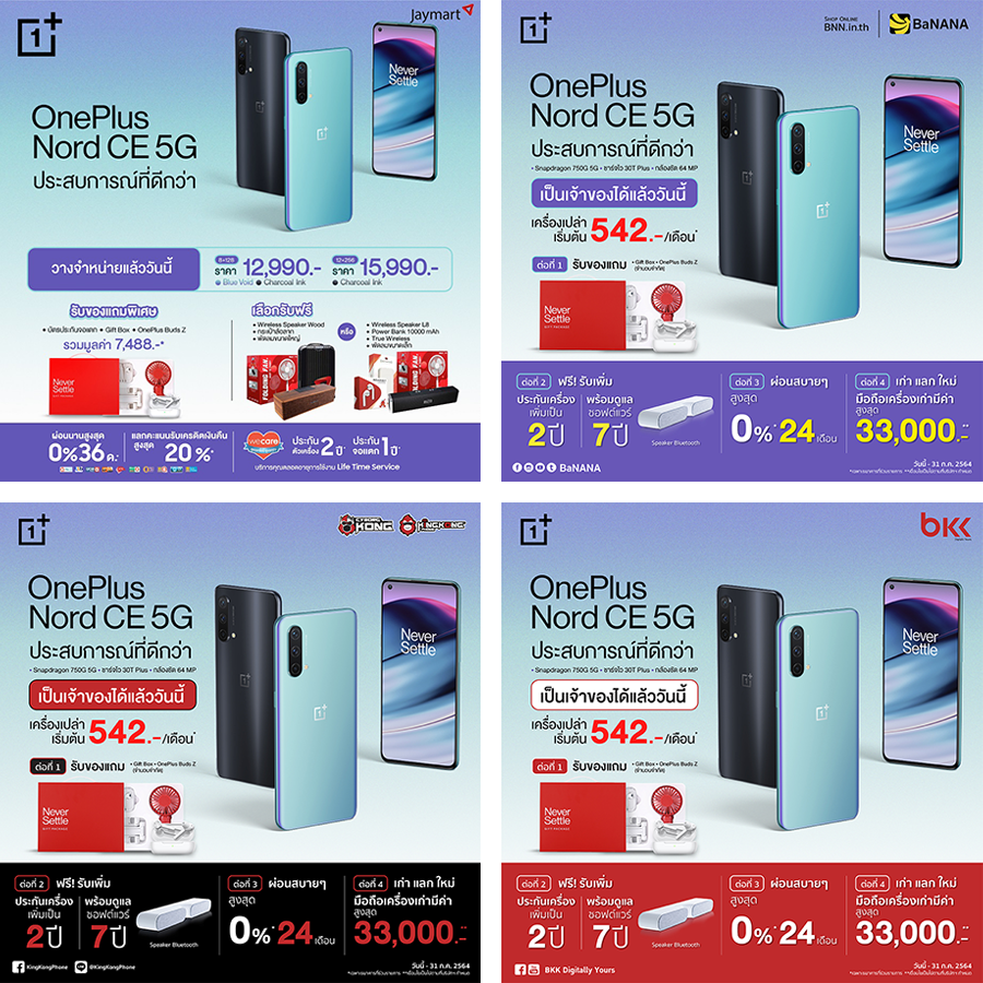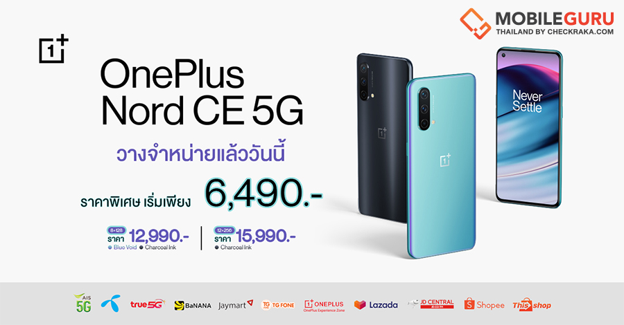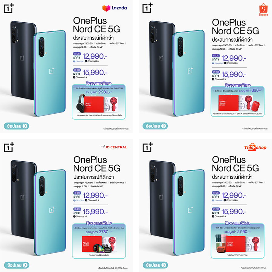 หาซื้อและเป็นเจ้าของ OnePlus Nord CE 5G ผ่านตัวแทนจำหน่ายอย่างเป็นทางการทั่วประเทศพร้อมรับฟรี! ของแถมสุดพิเศษจากแต่ละช่องทางการจำหน่ายและผู้ให้บริการเครือข่ายทั้งอย่าง AIS, DTAC และ TrueMove H รวมทั้ง Jaymart, BaNANA IT, TG FONE ที่ร่วมรายการทั่วประเทศ และ OnePlus Experience Zone by TG FONE ตลอดจนช่องทางออนไลน์ได้ที่ Lazada, Shopee, JD Central และ Thisshop
