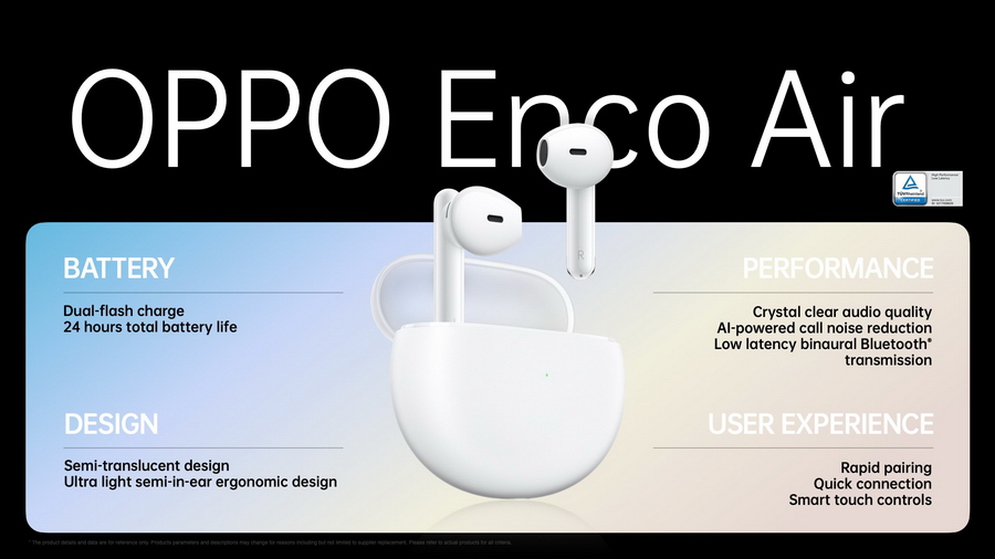 OPPO Enco Air มอบประสบการณ์ทางด้านเสียงคุณภาพสูงให้คุณสัมผัสได้ โดยผ่านการวิจัยและพัฒนาจากผู้เชี่ยวชาญ ประกอบด้วยฮาร์ดแวร์ที่ยอดเยี่ยม โดยใช้ Titanium-composite Dynamic Driver ขนาด 12 มม. ทำให้ได้เสียงเบสที่หนา หนักแน่น และเสียงกลางกับเสียงแหลมที่คมชัด นอกจากนี้ ผู้เชี่ยวชาญด้านเสียง Blu-ray จากออปโป้ยังได้ร่วมปรับแต่งเสียงที่จะทำให้ผู้ใช้ได้เพลิดเพลินกับเสียงอันสมดุล นุ่มนวล เป็นธรรมชาติ นอกจากนี้ ยังได้พัฒนาอัลกอริทึม AI ด้วยการฝึกให้ฟังข้อมูลการโทรมากกว่า 5 ล้านชั่วโมง เพื่อตรวจจับเสียงของมนุษย์และสามารถระบุเสียงรบกวนเพื่อตัดเสียงรบกวนและปรับปรุงให้เสียงโทรมีความคมชัดมากยิ่งขึ้นอีกด้วย ไม่ต้องกังวลเรื่องเสียงจะดีเลย์เมื่อเล่นเกมระหว่างใส่หูฟังคู่นี้ เพราะโหมดเกมบน OPPO Enco Air จะลดความหน่วงถึง 80ms โดยได้รับการยืนยันคุณภาพระดับโลกจาก TUV Rheinland