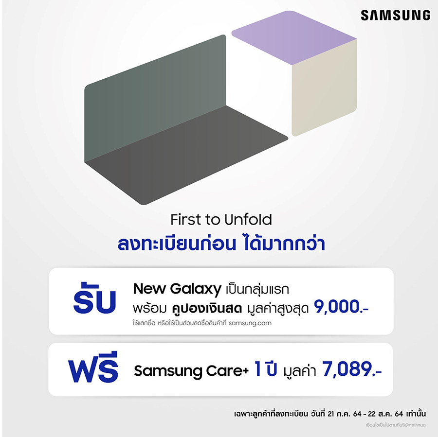www.samsung.com/th/unpacked ตั้งแต่วันนี้ – 22 ส.ค. 2564 เวลา 23.59 น. พร้อมรับสิทธิพิเศษที่มากกว่า ด้วยคูปองเงินสด มูลค่าสูงสุด 9,000 บาท ใช้แลกซื้อ หรือใช้เป็นส่วนลดซื้อสินค้าที่ samsung.com ในครั้งต่อไป ยิ่งไปกว่านั้น รับฟรี Samsung Care+ เป็นระยะเวลา 1 ปี มูลค่า 7,089 บาท โดยหลังจากที่ลงทะเบียนเป็นที่เรียบร้อยแล้ว กาแลคซี่แฟนจะได้รับโค้ดผ่านทาง E-mail เพื่อนำสิทธิ์ไปสั่งซื้อ The new Galaxy ผ่าน 2 ช่องทางหลักดังนี้