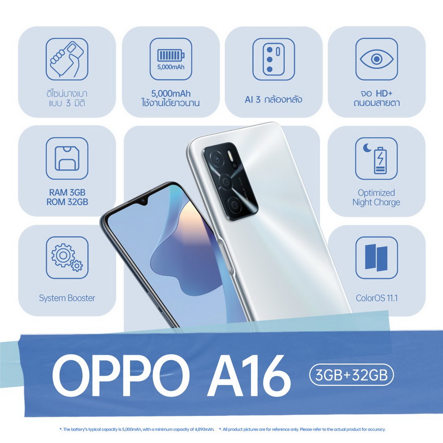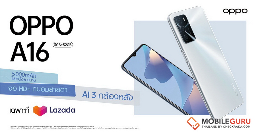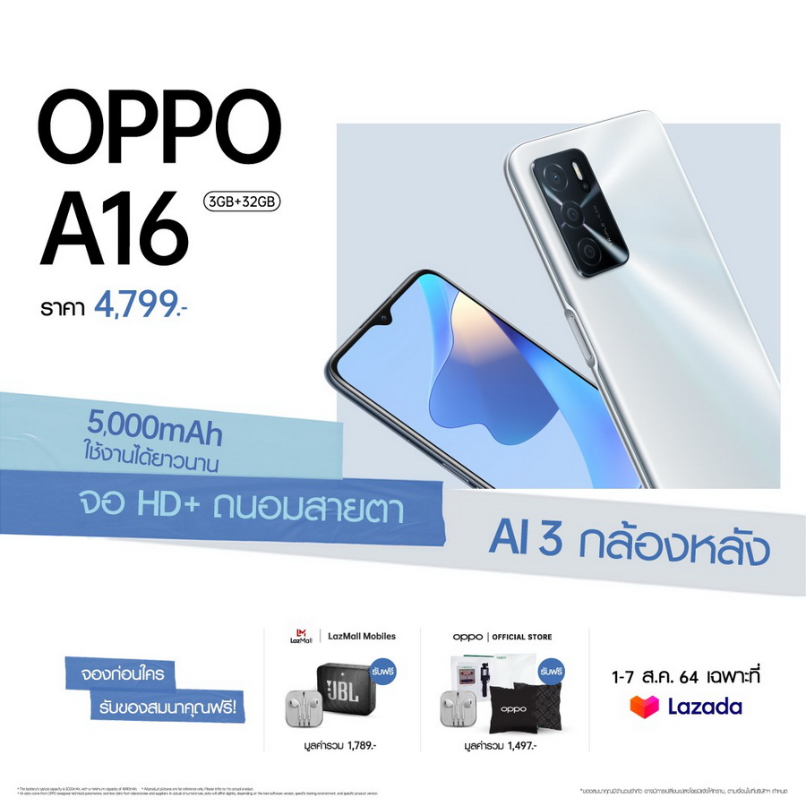 OPPO A16 (RAM 3GB + ROM 32GB) ราคา 4,799 บาท เปิดจอง 1 - 7 ส.ค. 64 ทาง Lazada เท่านั้น