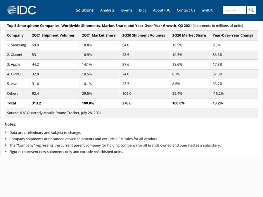 IDC ได้รายงานตัวเลขทางการตลาดของแบรนด์ผู้ผลิตสมาร์ตโฟนทั่วโลกประจำไตรมาสที่สองของปี 2021 ซึ่งจัดอันดับตามส่วนแบ่งทางการตลาดและอัตราการเติบโตของแต่ละแบรนด์ที่ทำได้ตั้งแต่ต้นปีจนถึงเดือนกรกฎาคมพบว่า Samsung ยังคงเป็นแบรนด์มือถือเบอร์ 1 ของโลกเช่นเดิม โดยสามารถจัดส่งสมาร์ตโฟนไปทั่วโลกรวมมากกว่า 59 ล้านเครื่อง ทำได้มากกว่าช่วงเวลาเดียวกันของปีที่แล้วอยู่ 4 ล้านเครื่อง และได้ส่วนแบ่งทางการตลาดในรอบนี้ไปได้ 18.8% แต่เมื่อเทียบกับส่วนแบ่งทางการตลาดของปีที่แล้วในช่วงเดียวกัน ถือว่า Samsung ทำส่วนแบ่งทางการตลาดได้น้อยลงถึง 0.5%
