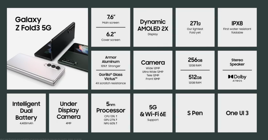 Samsung Galaxy Z Fold3 รองรับ 5G มาพร้อมชิปเซ็ตตัวแรง Snapdragon 888, RAM 12GB, ROM 256GB/512GB, รองรับ WiFi 6E, ทำงานบน Android 11 ครอบทับด้วย One UI 3, ลำโพงคู่ รองรับระบบเสียง Dolby Atmos, แบตเตอรี่ความจุ 4,400 mAh รองรับชาร์จเร็ว 25W และชาร์จไร้สาย 11W และชาร์จไร้สายย้อนกลับ 4.5W, สำหรับรุ่นนี้จะมาพร้อมกล้อง 3 เลนส์ ความละเอียด 12MP F1.8 + 12MP F2.2 Ultra Wide + 12MP F2.4 Tele