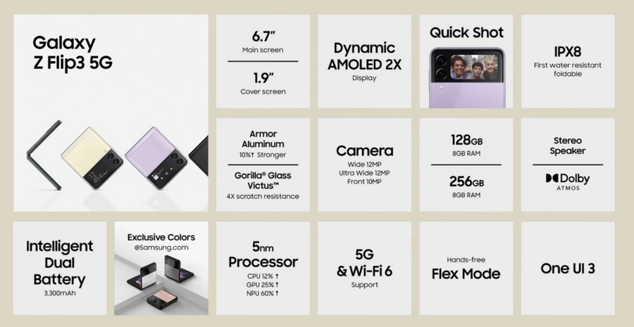 Samsung Galaxy Z Flip3 สมาร์ทโฟนพับได้ทรงน่ารักแต่ดูพรีเมี่ยม วัสดุพรีเมี่ยมโลหะและกระจก Gorilla Glass Victus รองรับมาตรฐานกันน้ำและฝุ่นระดับ IPX8 เช่นกัน ด้านหน้ามีหน้าจอขนาดเล็กแต่ก็ใหญ่กว่ารุ่นเดิมเป็นหน้าจอ Super AMOLED ขนาด 1.9 นิ้ว ความละเอียด 260 x 512 pixels สำหรับดูการแจ้งเตือน และใช้งานแอปพลิเคชั่นที่รองรับ โดยไม่ต้องกางหน้าจอออก เมื่อกางออกจะเป็นหน้าจอ Dynamic AMOLED 2X ขนาด 6.7 นิ้ว ความละเอียด Full HD+ รองรับอัตราการรีเฟรช 120Hz (ไม่รองรับ S Pen)