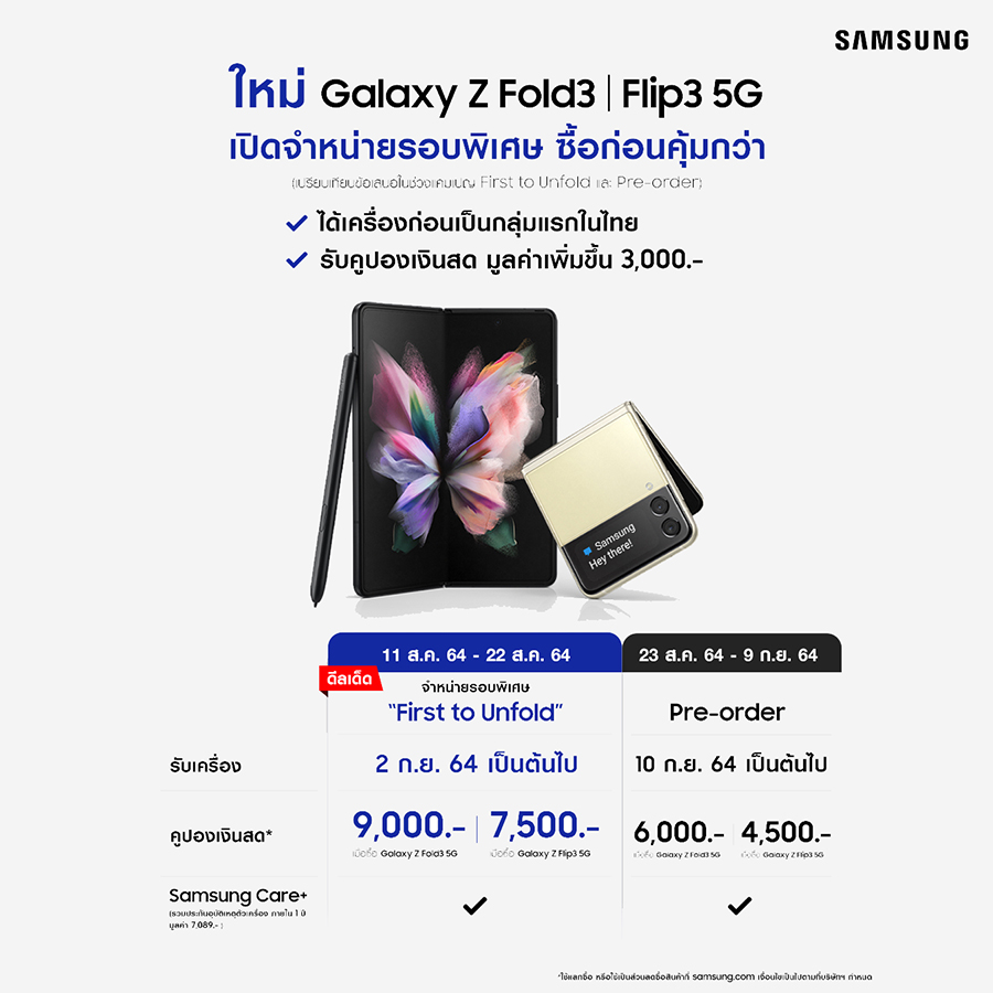 ทั้งนี้ ซัมซุงได้เปิดจำหน่ายรอบพิเศษ ที่ซื้อก่อนคุ้มกว่า กับ 'First to Unfold' ตั้งแต่วันนี้ – 22 ส.ค. 64 นอกจากที่จะได้เครื่องก่อนเป็นกลุ่มแรกในไทย ในวันที่ 2 ก.ย. 64 เป็นต้นไปแล้ว ยังจะได้รับคูปองเงินสดเพิ่มขึ้นอีก 3,000 บาท รวมเป็นมูลค่า 9,000 บาท เมื่อซื้อ