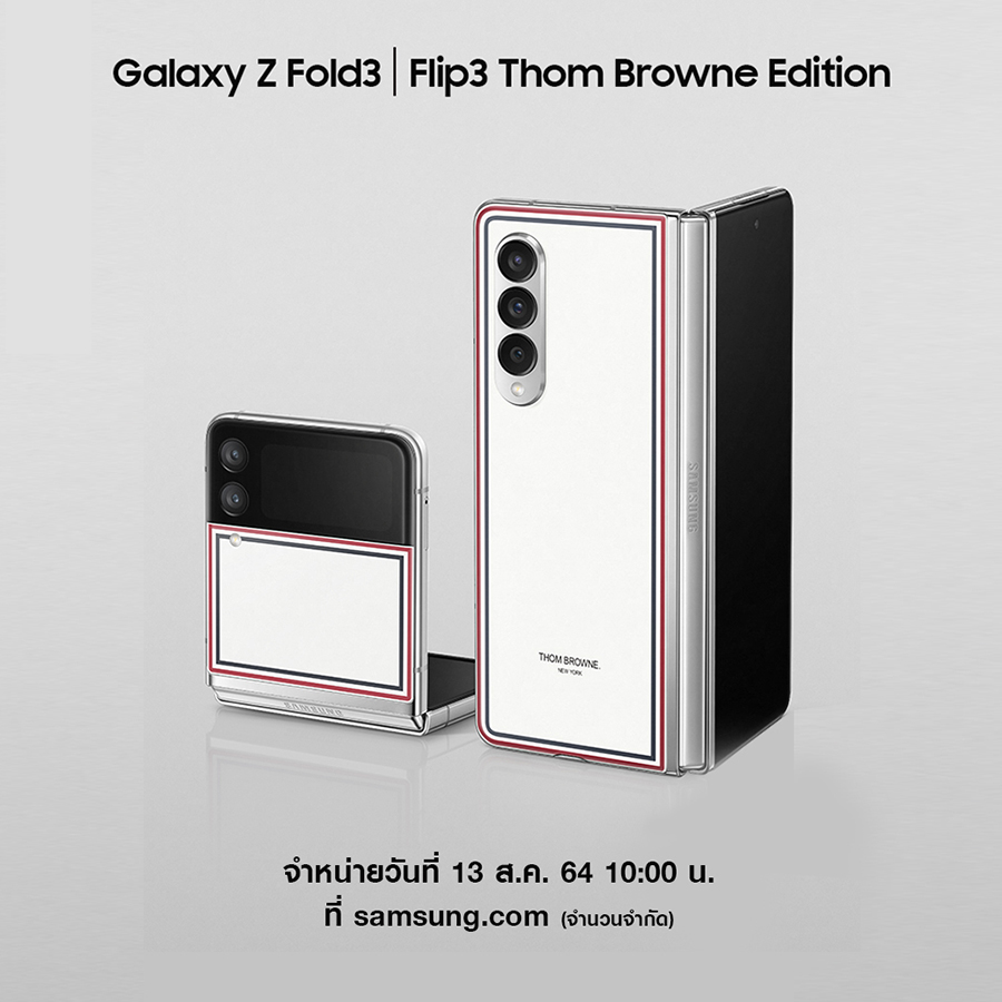 เปิดจำหน่าย Galaxy Z Fold3 | Flip3 Thom Browne Edition ในวันที่ 13 สิงหาคม 2564 เป็นต้นไป ผ่านทาง Samsung.com เพื่อรับเครื่องในวันที่ 27 สิงหาคม 2564 มีจำนวนจำกัดเพียง 100 เซ็ตต่อรุ่นเท่านั้น